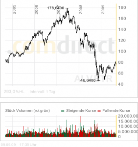 Auch die Allianz bietet mit 4,5% eine attraktive Dividendenrendite. Allerdings ist die Allianz als Finanztitel im Rahmen der Finanzkrise so stark in den Keller geprügelt worden, dass nunmehr auch das Aufholpotential entsprechend groß ist. Der Kurs fiel von 180 auf 46 Euro, inzwischen hat sich die Aktie wieder auf 82 Euro erholt. Das KGV von 9 ist günstig und die Gewinne werden bereits im kommenden Jahr wieder kräftig ansteigen, so dass ein deutlich höheres Kursniveau erreicht werden kann.